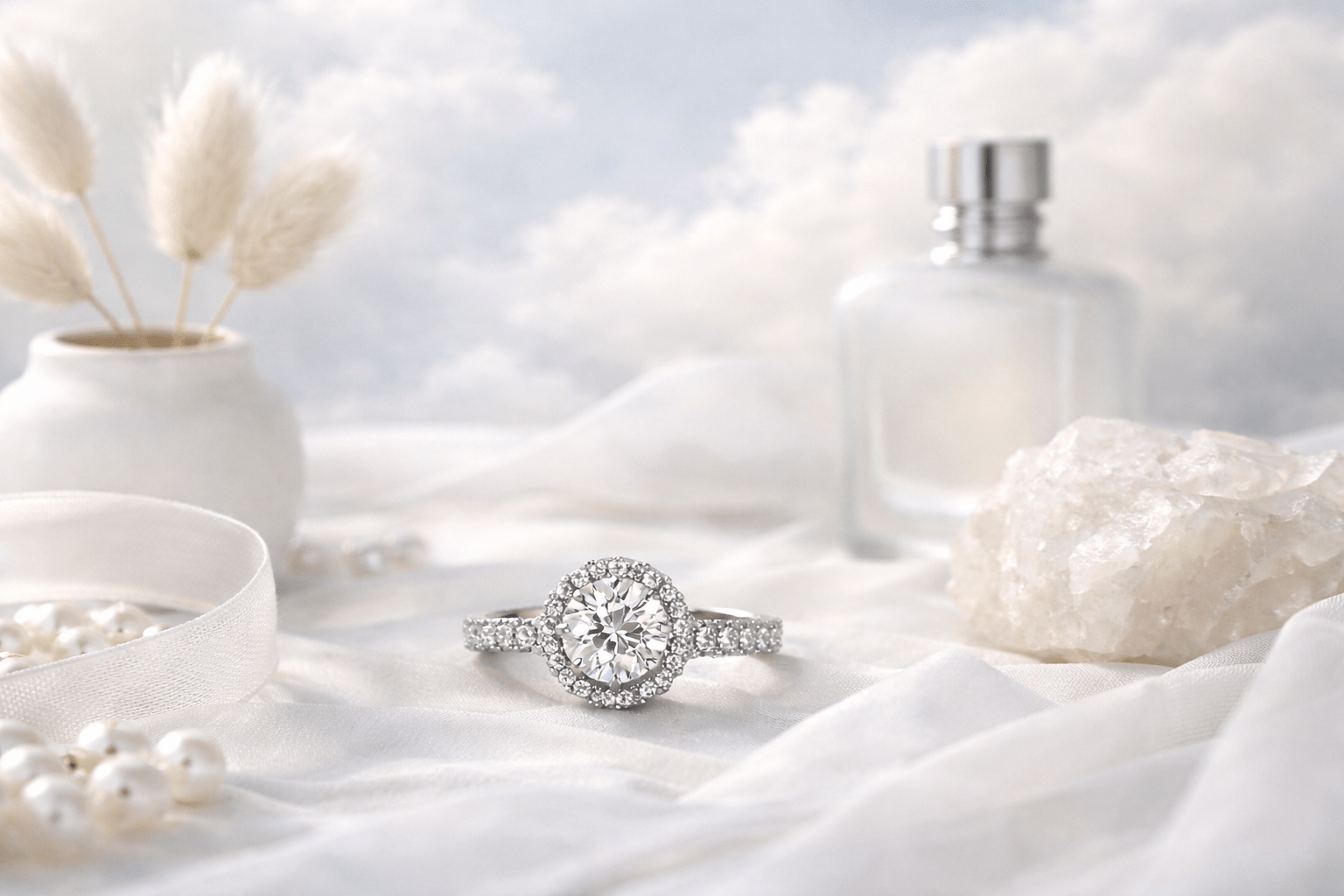 – Gioielli: oro bianco, diamanti e perle.